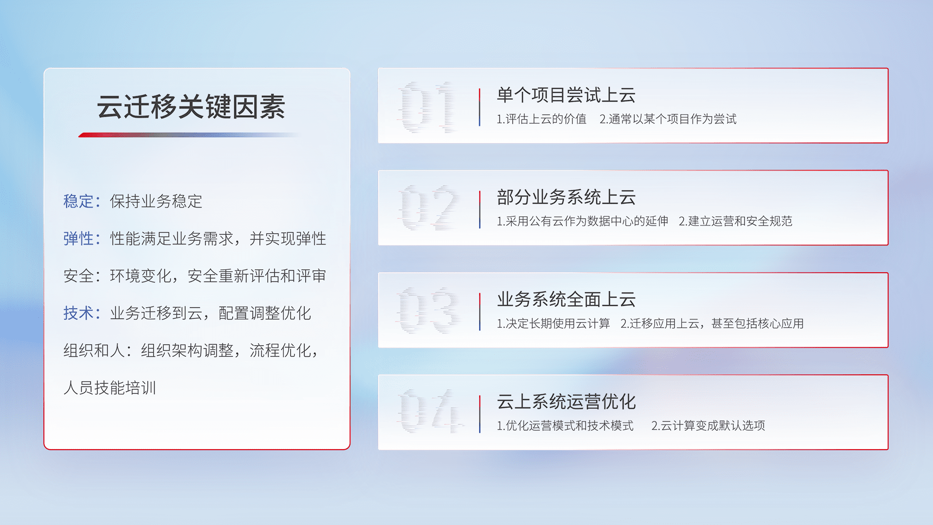 结合实际业务,,,从规划设计、、、云平台选型、、、、云原生改造、、数据迁移、、集成交付,,迁移全过程为客户识别最佳上云路径,,,做好风险识别管理,,,,设计网络架构、、身份权限、、安全审计合规、、、、操作审计、、、、日志审计、、、监控告警策略、、多站点容灾设计等,,,,对云上基础设施进行整体规划,,提升IT治理水平,,以满足弹性、、高可用、、、高性能的需求。。